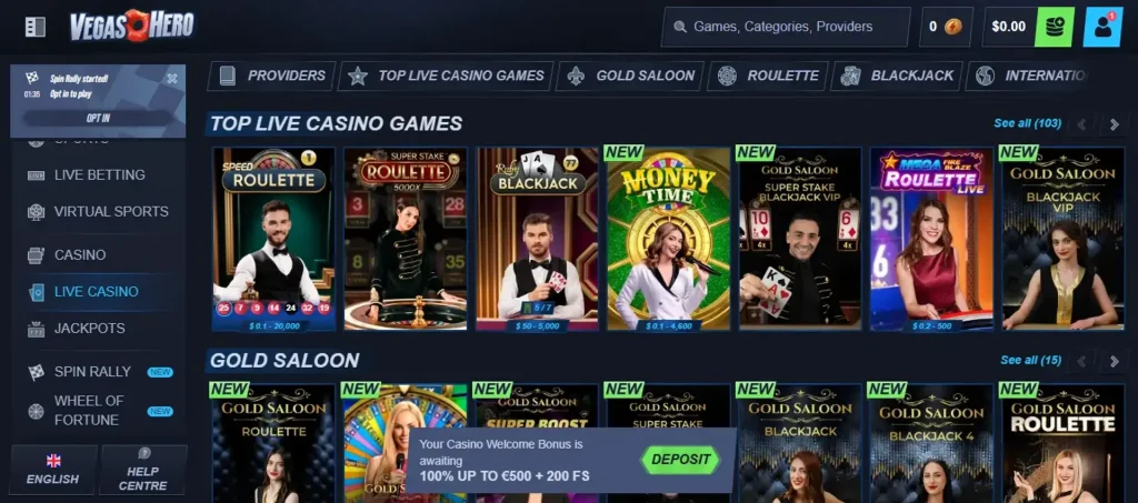 VegasHero Casino séduit par son thème super-héros dynamique et énergique qui plonge les joueurs dans une ambiance fun et immersive. Lancé en 2025, ce casino hybride (casino + paris sportifs) propose une ludothèque impressionnante de plus de 1 300 jeux, avec certaines sources mentionnant jusqu’à 15 000 titres selon les ajouts réguliers. On y trouve un vaste choix de slots modernes, jeux de table classiques, casino en direct alimenté par Evolution et Pragmatic Play, ainsi qu’une section complète de paris sportifs.