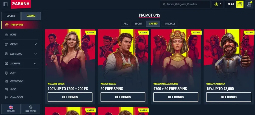 Rabona Casino est un géant du marché francophone qui combine avec succès casino en ligne et paris sportifs. Avec une ludothèque impressionnante allant de 4 000 à 11 000 jeux selon les sources, il offre un choix colossal : machines à sous modernes, jeux de table, casino en direct, mini-jeux et une section sportsbook particulièrement complète et compétitive.